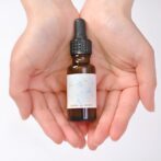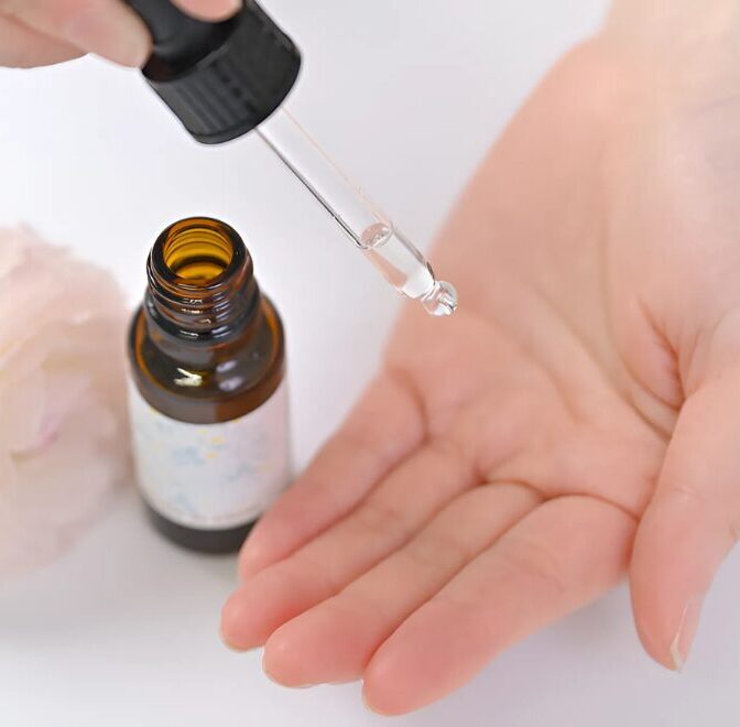 1)化粧水のあとにスポイトで適量を手に取り、手のひらで軽く温めます。