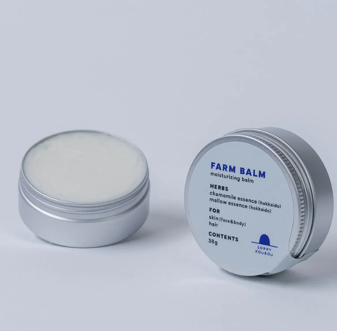 SORRY KOUBOUのファームバームは、お顔だけでなく、ヘアバーム、ハンドクリーム、リップバームとしても使えるマルチバームです。 摩擦の刺激が少なく肌なじみの良いオーガニック植物オイルをベースに、保湿効果の高いカモミールとマローのハーブチンキを配合。 寒い季節でも固まりにくく、柔らかで指ですくいやすいテクスチャーに仕上げました。 肌を優しく包み込み、なめらかで快適な使用感を実現しています。 ギフトとしてもおすすめのアイテムです。